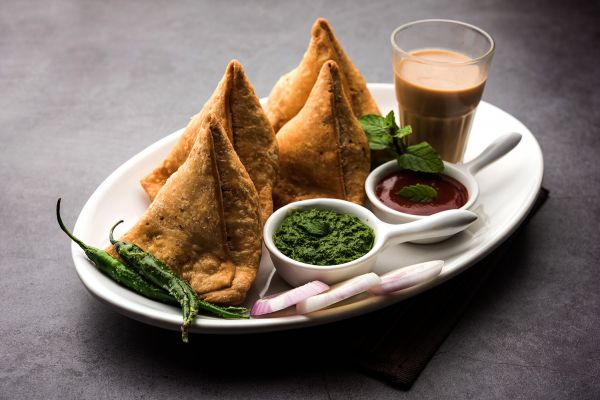 Samosa - Knusprige Teigtaschen gefüllt mit gewürzten Kartoffeln und Erbsen. Serviert mit Minzchutney.