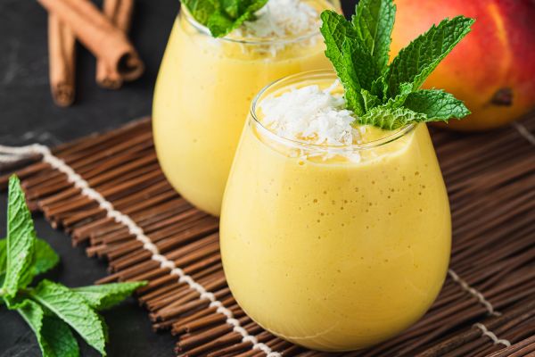 Mango Lassi - Erfrischender Joghurt-Drink mit frischem Mangopüree und einer Prise Kardamom.